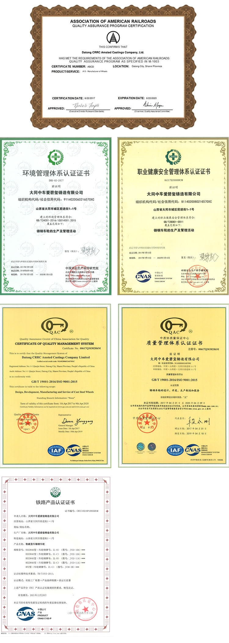 大同中車愛碧璽鑄造有限公司不斷加強質量和環境管理,先後通過AAR M107/M208,AAR M1003,ISO9001:2008,GB/T24001-2001idtISO14001:2004 和 GB/T28001-2001等認證。