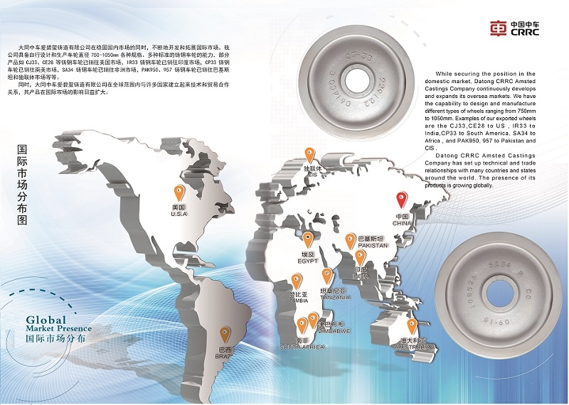 大同中車愛碧璽鑄造有限公司在穩固國內市場的同時,不斷地開發和拓展國際市場。我公司具備自行設計和生產車輪直徑750~1050mm各種規格、各種標準的鑄鋼車輪的能力,部分產品如CJ33、CE28等鑄鋼車輪產品已進入美國市場,IR33鑄鋼車輪進入印度市場,CP33鑄鋼車輪進入南美市場,SA34鑄鋼車輪已銷往非洲市場,PAK950、957鑄鋼車輪已銷往巴基斯坦和獨聯體市場。