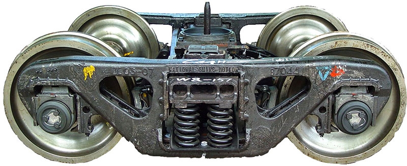 轉K4型轉向架主要用於最高運行速度120km/h及以下、軸重21t及(ji)以(yi)下(xia)的(de)中(zhong)國(guo)標(biao)準(zhun)軌(gui)距(ju)各(ge)型(xing)鐵(tie)路(lu)貨(huo)車(che)。彈(dan)簧(huang)托(tuo)板(ban)通(tong)過(guo)搖(yao)動(dong)座(zuo)置(zhi)於(yu)側(ce)架(jia)中(zhong)央(yang)承(cheng)台(tai)內(nei)的(de)搖(yao)動(dong)座(zuo)支(zhi)承(cheng)上(shang),把(ba)左(zuo)右(you)側(ce)架(jia)連(lian)接(jie)在(zai)一(yi)起(qi),提(ti)高(gao)了(le)轉(zhuan)向(xiang)架(jia)的(de)抗(kang)菱(ling)剛(gang)度(du);zuoyoucejiatongguoqidingbudaokuangyaodongzuofenbiezhichengzaiqianhouliangchengzaianshang,zuoyouliangcejiachengweihengxiangketongbubaidongdediaogan,zengjialecheliangdehengxiangrouxing,youxiaojiangdilelunguijiandemohao;對側滾振動控製加強,振動轉動中心降低,有效地減小了爬軌和脫軌的可能性,尤其提高了高重心貨車的脫軌安全性。