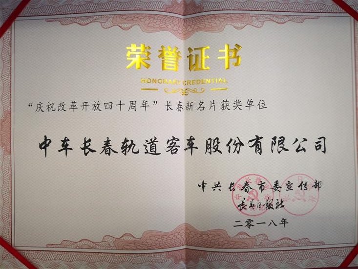 2018年12月,公司在長春市改革開放40周年“長春新名片”頒獎儀式上榮獲“長春新名片”榮譽稱號。
