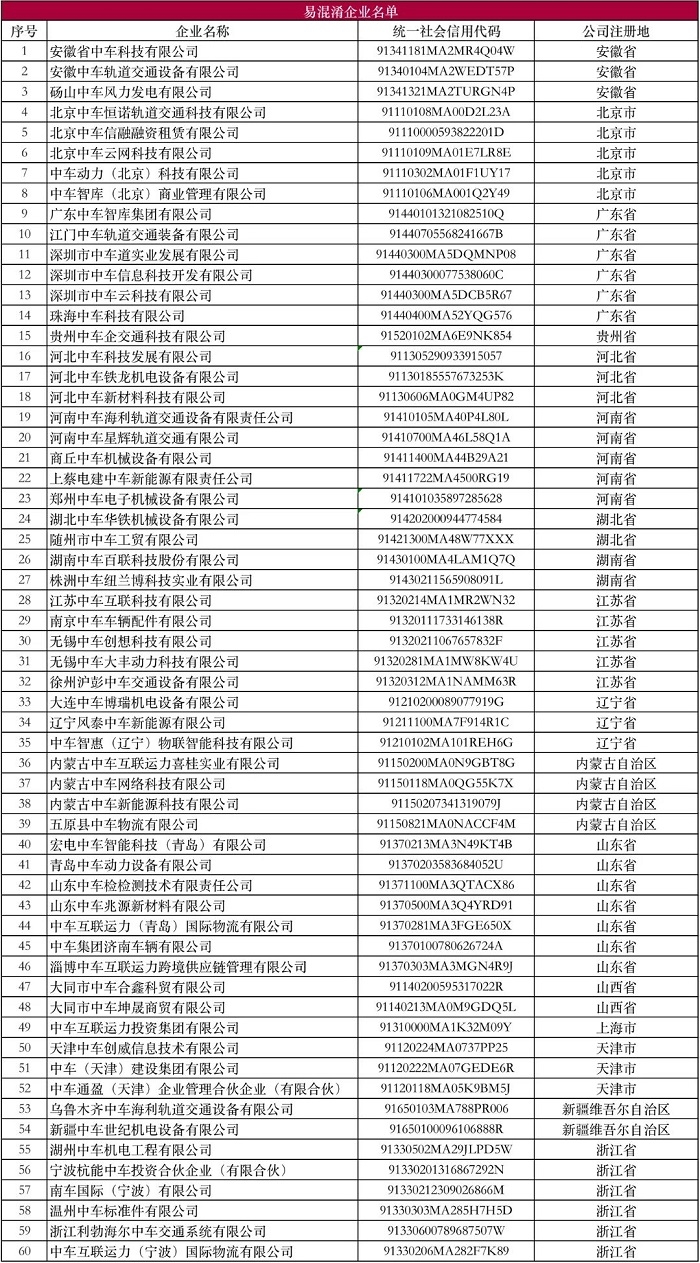 此次公告涉及60家第三方企業,中國中車將視情況更新澄清名單。此次公告中涉及的公司及“國家企業信用信息公示係統”中顯示與中國中車無隸屬或股權關係的第三方企業,其相關市場經營行為與中國中車及所屬各級子公司無任何關聯。