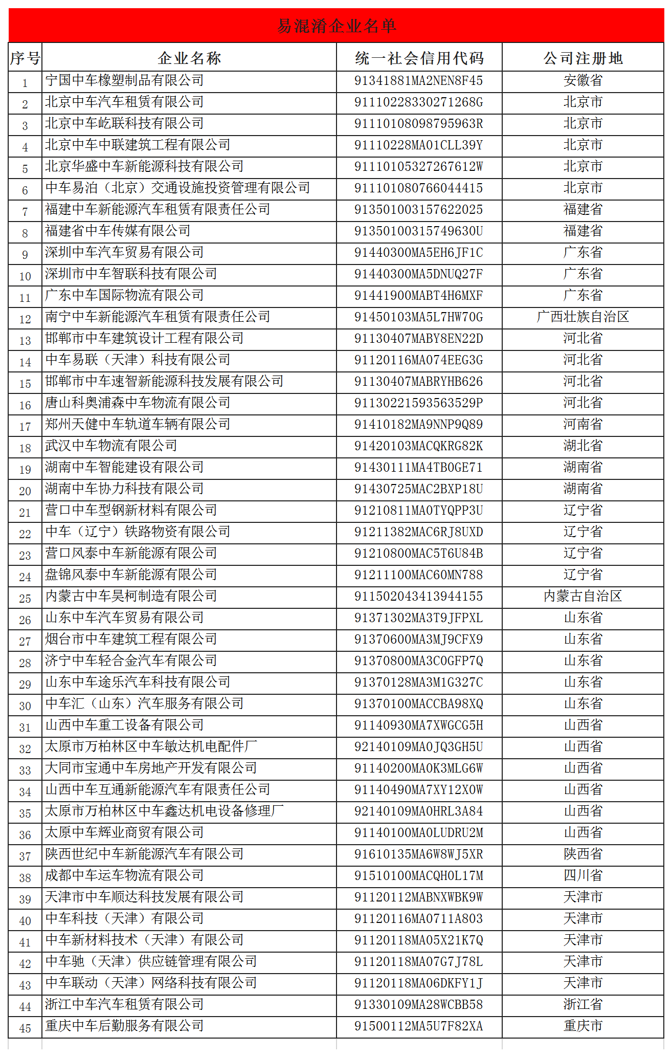 此次公告涉及45家第三方企業,中國中車將視情況更新澄清名單。此次公告中涉及的公司及“國家企業信用信息公示係統”中顯示與中國中車無隸屬或股權關係的第三方企業,其相關市場經營行為與中國中車及所屬各級子公司無任何關聯。