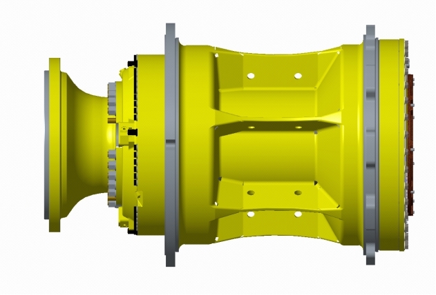 產品概述:G70010機械式終傳動集成了傳動、行駐車製動功能,傳動形式采用NGW一級行星傳動,製動為雙活塞的行駐車一體式製動器,是由中車戚墅堰所設計製造的百噸級以下小噸位機械式終傳動產品,匹配90噸級機械傳動礦用自卸車,目前在樣機試製階段。