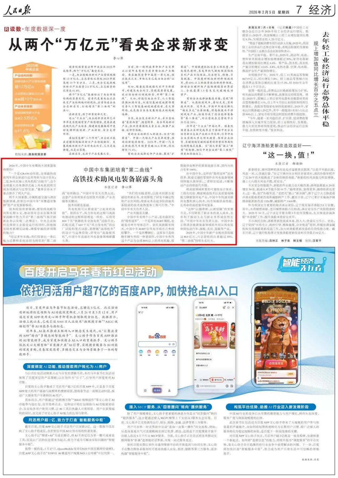 2月5日,《人民日報》以《高鐵技術助風電裝備嶄露頭角》為題,報道了中國中車如何培育“第二曲線”,通過技術同源、產業共鏈,探索出一條以能力遷移和係統協同為特征的“第二曲線”培育路徑,為央企轉型升級提供了中車答案。現將文章轉載如下: