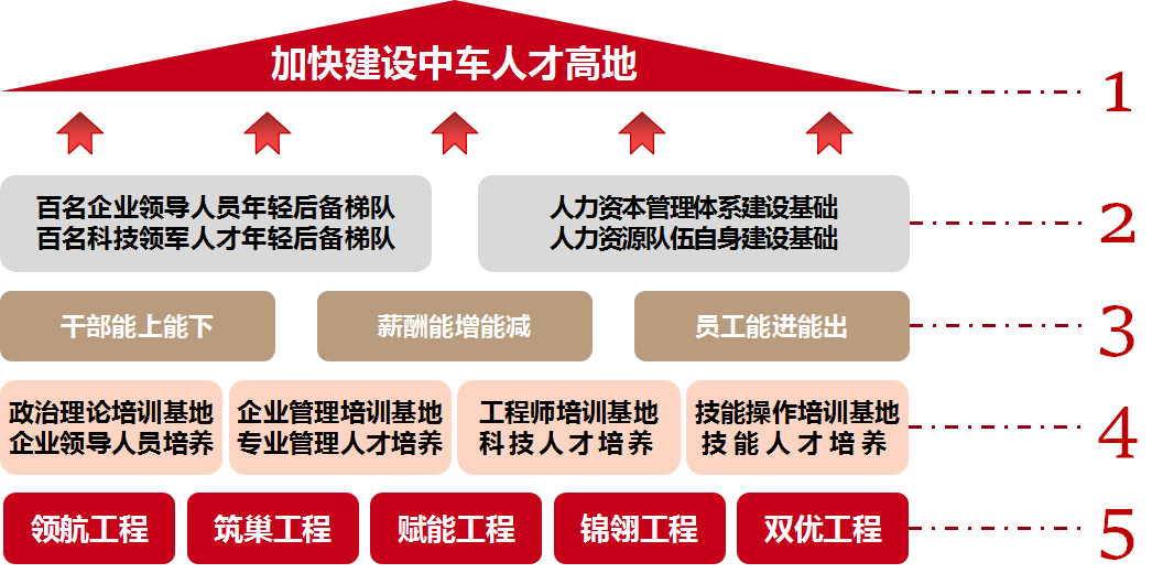 推進實施“12345”人才工作總體部署。“1”是聚焦一個主題,即加快建設中車人才高地。“2”是打造“雙梯隊”、夯實“兩基礎”,即重點打造100名左右企業領導人員年輕後備梯隊和100名左右科技領軍人才年輕後備梯隊,著力夯實人力資本管理體係建設基礎和人力資源管理者隊伍自身建設基礎。“3”是深化三項製度改革,即全麵深入推進市場化經營機製改革。“4”是建設四類培訓基地、強化四類人才培養,即建設“政治理論、企業管理、工程師、技能操作”四類培訓基地,科學性、係統性、針對性、階梯性培養企業領導人員、專業管理人才、科技人才、技能人才四類人才。“5”是實施人才強企“五項工程”,即領航工程、築巢工程、賦能工程、錦翎工程、雙優工程。