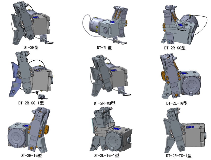 DT係列共11種單元製動器,其中DT-1型為常用行車單元製動器、DT-2型為帶停放功能單元製動器。11種型號的新型機車踏麵單元製動器順利通過了中鐵總CRCC認證、美國PAPP認證、型式試驗和裝車試運行的檢驗,其性能參數全麵達到進口產品水平。該係列單元製動器具有體積小、質量輕、傳動效率高、拆裝方便等特點,可快速補償閘瓦與車輪的磨損量,保持恒定的閘瓦間隙。DT-2型因其獨有的側向可移吊臂結構,可以完善的解決三軸機車轉向架中間軸閘瓦左右偏摩問題。為適應客戶對製動器安裝方式、製動力、閘瓦型號等不同特殊需求,我們還可以基於DT-1型、DT-2型單元製動器基礎上進行改進設計。