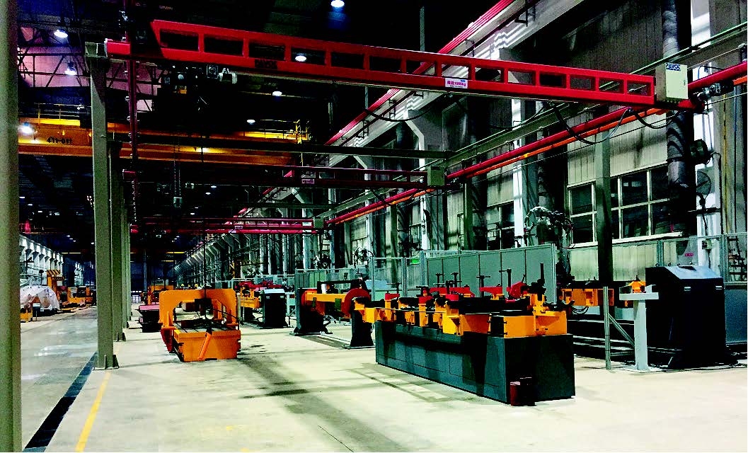 The coupler, bolster, and buffer assembly (CBB assembly) comprises the traction beam, bolster beam, and buffer beam. It is an essential component of the steel structure of railway vehicle bodies and plays a significant role in the traction and braking forces of the vehicle. The production line has a capacity of producing four units per day in a single shift, which can meet the welding production requirements for carbon steel CBB components of 160 km/h power-concentrated EMUs, as well as 25G and 25T type vehicles.