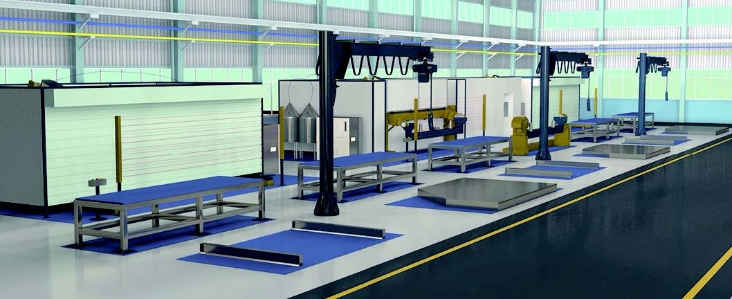 The overall production layout is divided into three independent sub-production areas for the group welding of traction beams, bolster beams, and buffer beams, with internal processes flowing according to the technological sequence. The production line is centrally coordinated and controlled from a central control room.