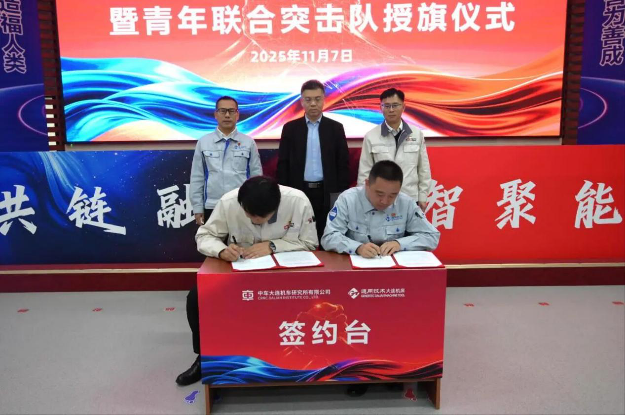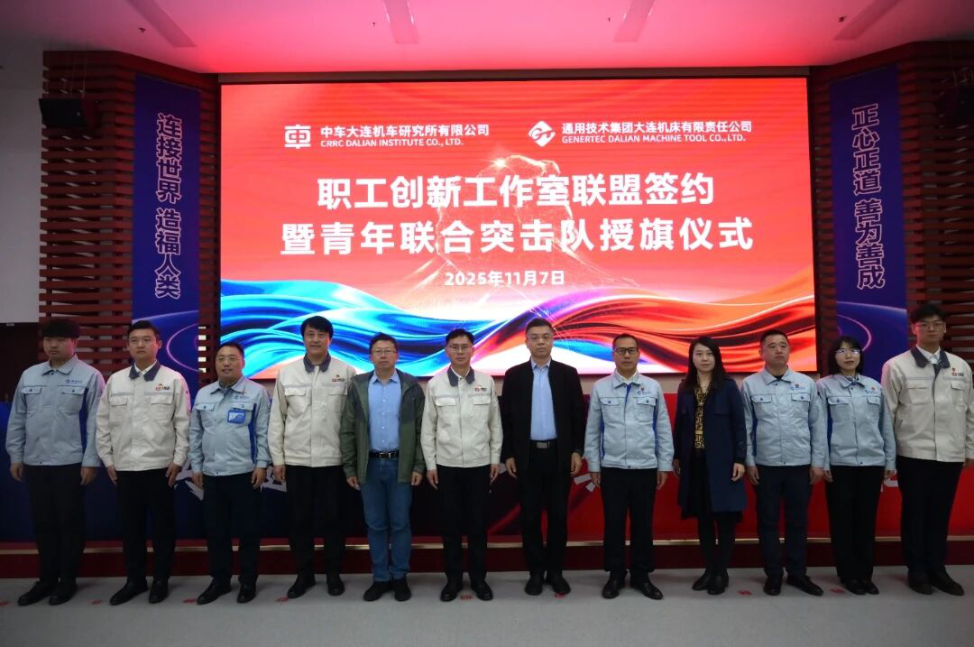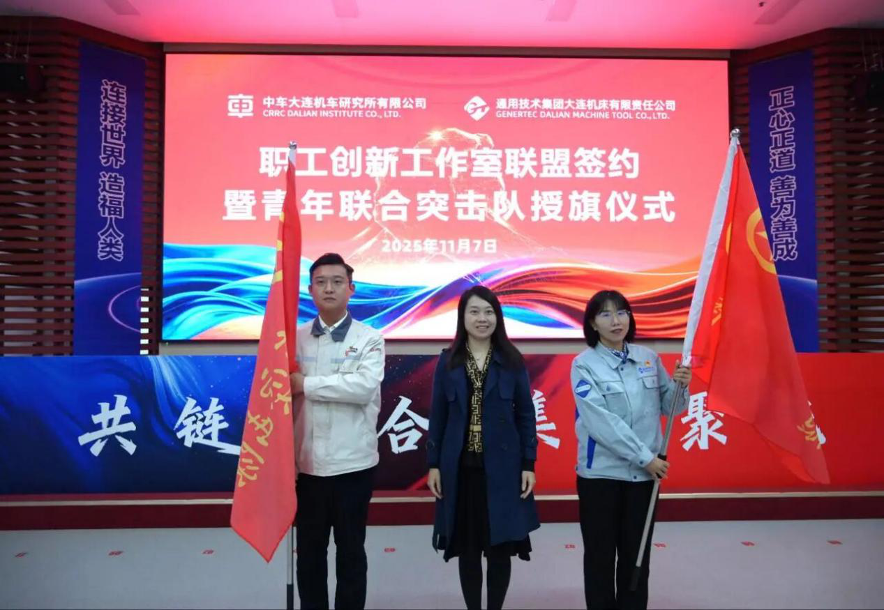 中車大連所&通用技術大連機床公司職工創新工作室聯盟簽約暨青年聯合突擊隊授旗儀式圓滿舉行。11月7日上午,在中車大連所旅順所區,以“共鏈融合 集智聚能”為主題,兩家企業職工創新工作室聯盟簽約暨青年聯合突擊隊授旗儀式隆重舉行。