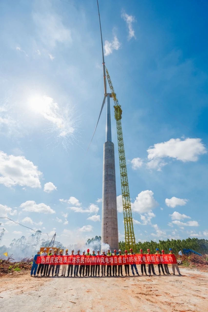 Recently, the Suixi Jianghong-Lemin 100MW wind power project completed the installation of its first 185-meter hybrid wind turbine tower. It is not only the highest onshore wind turbine tower in the world but also the first wind power project globally with an ultra-high anti-typhoon tower implemented in an area with frequent typhoons.