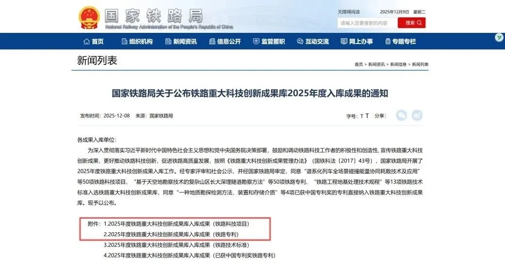 The annual selection is an authoritative national initiative organized by the National Railway Administration to promote scientific and technological innovation in the railway sector, encourage innovation among railway professionals, and support the high-quality development of railway technologies. Following rigorous expert review, public consultation, and final approval, a total of 50 railway technology projects, 50 railway patents, 13 technical standards, and 4 China Patent Award–winning patents were included in the 2025 repository.