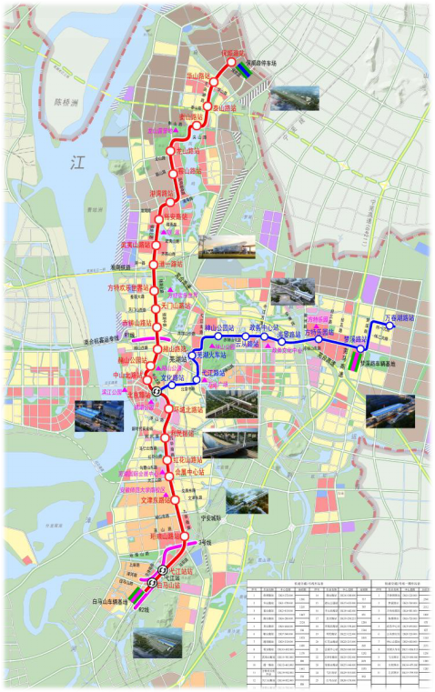2號線一期線路全長15.787 km,其中地下線長1.409 km,地麵及高架線14.378 km。全線共設車站11座(高架站10座、地下站1座),其中換乘站3座,分別為北京路站(與1號線換乘)、弋江路站(與R3線換乘)、政務中心站(與3號線換乘)。最大站間距2.538 km,位於萬春湖路站至夢溪路站區間;最小站間距0.815 km,位於政務中心站至雲從路站區間;全線平均站間距1.547 km。