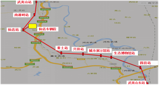 武夷新區旅遊觀光軌道交通武夷山東站至武夷山景區線工程PPP項目建設地點武夷山市、建陽區,工程線路基本走向沿快速通道(303省道改造工程),並沿303省道中央分隔帶布置。線路全長約26.17 km,其中地麵線路18.45 km,高架線路7.72 km。全線設車站9座,沿線依次為武夷山東站、固縣站、生態博物院站、城市展示館站、興田站、黃土站、仙店站、南源嶺站、武夷山站,車輛段1座。