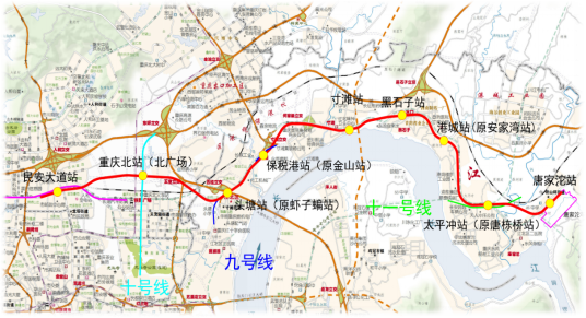 軌道交通四號線是重慶軌道線網規劃中重要的骨幹線路之一,是一條由西向東走向的放射線,西起民安大道站、東至唐家沱站,途經渝北區、江北區2個行政區,串聯火車北站綜合交通樞紐、兩路寸灘保稅港區、唐家沱組團等重要區域。線路全長16.05 km,其中:地下線10.99 km,高架線5.06 km。設車站9座,其中:地下站5座(民安大道、重慶北站(北廣場)、頭塘、保稅港、港城),高架站2座(寸灘、太平衝),地麵站2座(黑石子、唐家沱),平均站間距1.97 km;換乘站5座,分別與環線(民安大道)、十號線(重慶北站(北廣場))、九號線(頭塘、保稅港)、十一號線(太平衝)換乘,設唐家沱車輛段1座。