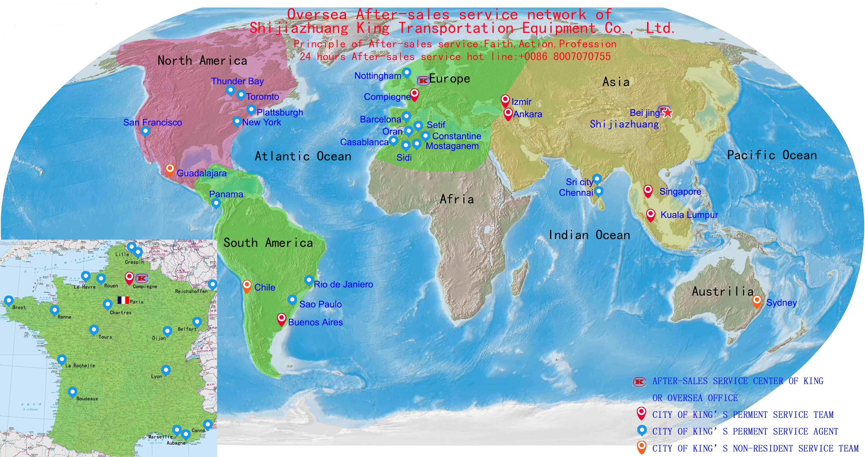 To ensure the service timeliness of overseas projects, King has permanent service personnel in Malaysia, Turkey, Argentina and France, has a European office in France, and has local service agents in such countries as France, UK, Brazil, Canada, USA, Morocco, Algeria and India.