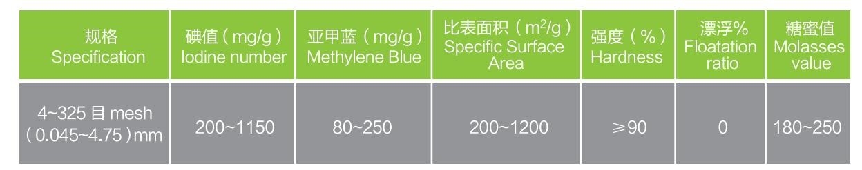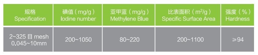 以優質椰子殼、杏xing殼ke等deng為wei原yuan料liao,經jing一yi係xi列lie生sheng產chan工gong藝yi精jing製zhi而er成cheng。優you點dian是shi孔kong隙xi結jie構gou發fa達da,比bi表biao麵mian積ji大da,吸xi附fu性xing能neng強qiang,化hua學xue性xing能neng穩wen定ding,易yi再zai生sheng。廣guang泛fan應ying用yong於yu食shi品pin、醫療、礦山、冶金、石化、煉鋼、煙草、精細化工等行業。尤其適用於高純度生活飲用水、工業用水深度淨化等方麵。