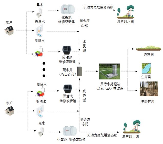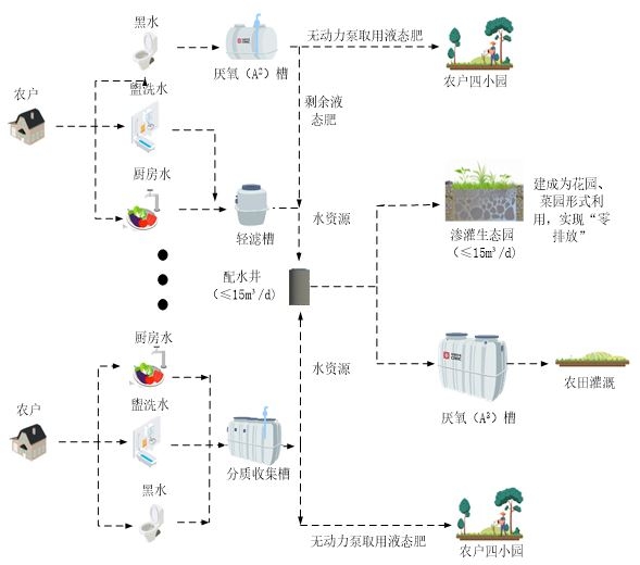 分質收集,黑水資源化菌劑高效處理,實現氮磷資源轉化與利用。