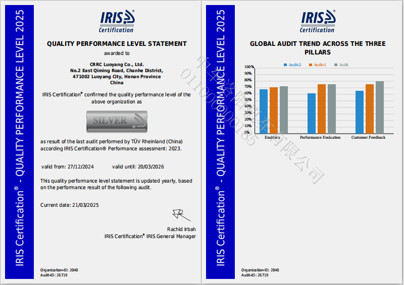 近日,萊茵公司審核專家組一致認為洛陽公司質量管理體係運行有效,並授予軌交行業質量管理體係銀牌證書。