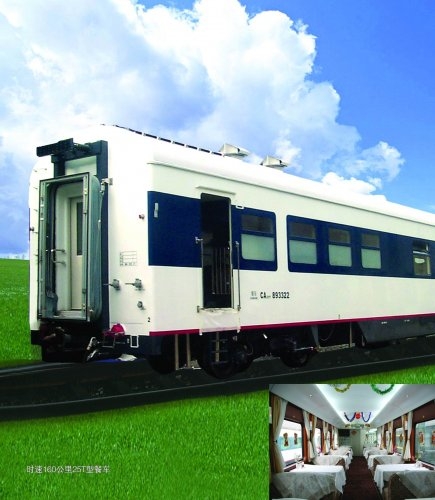 CA25T型特快餐車2004年開始生產,采用25A型鋼結構參數和SW220K型轉向架,構造速度170km/h,以後可提速至200km/h。密接式車鉤,彈性膠泥緩衝器,折棚密封風擋,DC600V集中供電,車頂單元空調。兩側安裝裙板采用電氣化廚房設備。同年,生產第二批CA25T特快餐車時,車下枕內電氣布線采用整體模塊裝車,采用PLC控製無主網絡監控係統,實現全自動監控