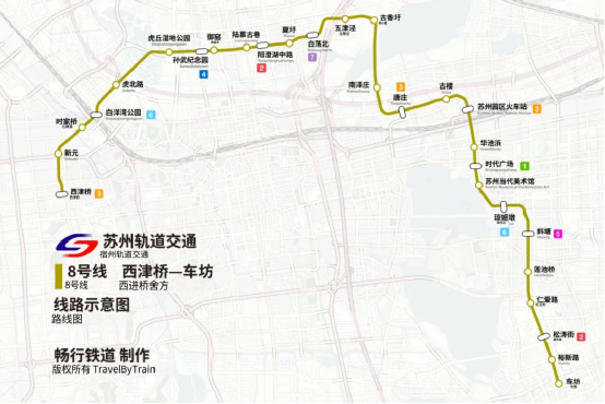 蘇州軌道交通8號線全長約35.6公裏,設站28座,是古城外圍從西北到東南的骨幹線路,線路起於蘇州高新區的西津橋站,止於蘇州工業園區車坊站,呈西北—東南走向。