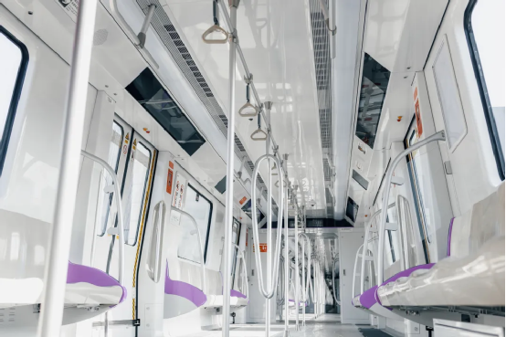 列lie車che采cai用yong防fang寒han吸xi音yin材cai料liao和he自zi主zhu研yan發fa轉zhuan向xiang架jia,有you效xiao降jiang低di了le噪zao音yin和he振zhen動dong,提ti升sheng了le乘cheng客ke的de乘cheng車che舒shu適shi度du。同tong時shi還hai配pei備bei了le帶dai攝she像xiang和he噪zao檢jian功gong能neng的de乘cheng客ke緊jin急ji報bao警jing器qi、大尺寸液晶動態地圖顯示屏等先進設施,為乘客提供了更加便捷、直觀的乘車體驗。同時,車體采用環保材料和環保製冷劑,設置空氣監測裝置,監測客室內空氣的 CO2 濃度、濕度、PM2.5、TVOC含量,為乘客打造了一個潔淨、健康的乘車環境。