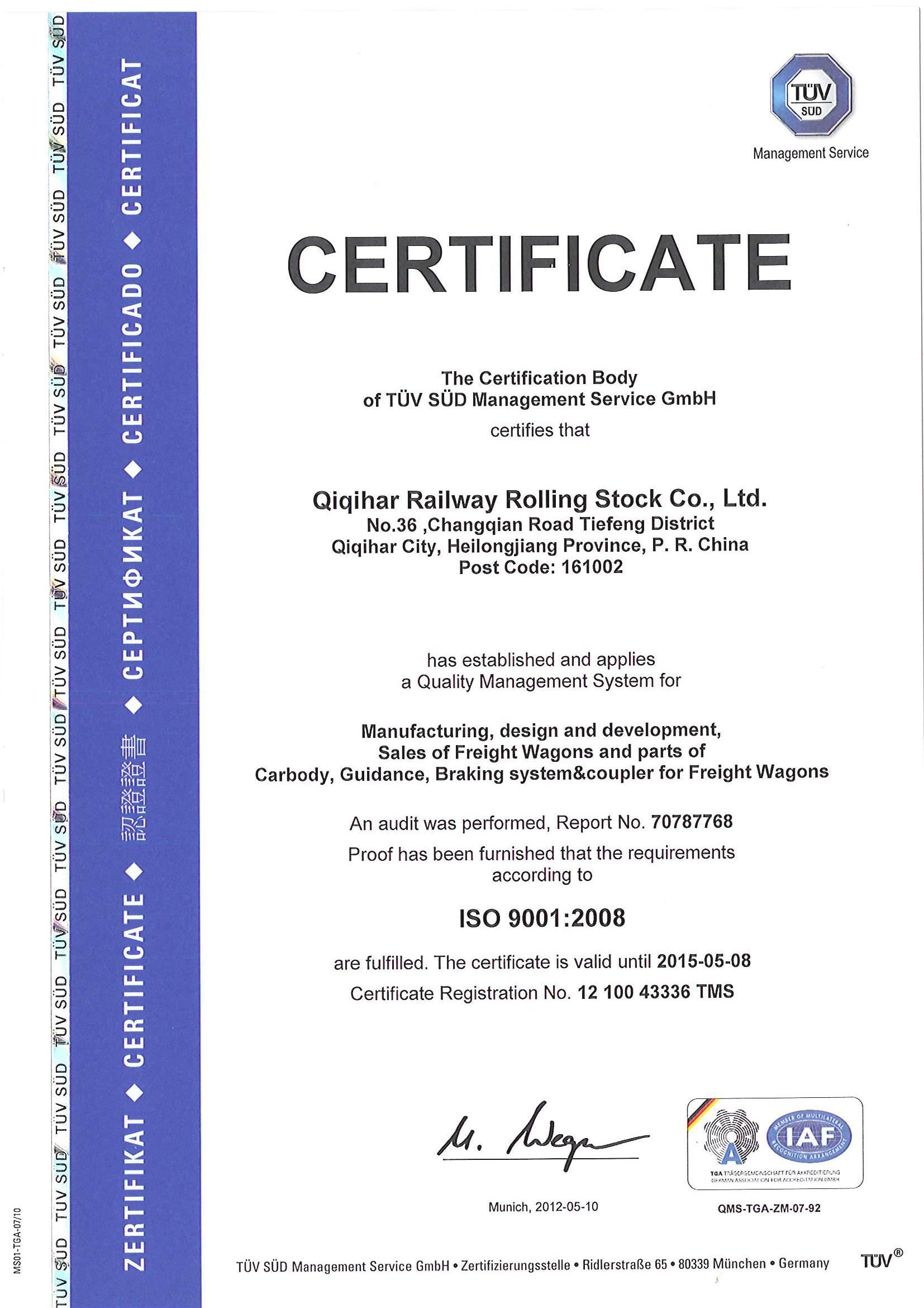 齊軌道裝備公司IRIS體係證書