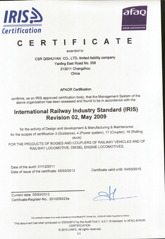 IRIS管理體係認證證書