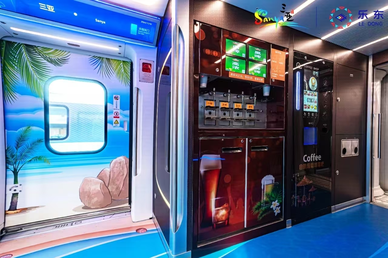 11月16ri,hainansanyazhiledonglvyoutielukaitong,zhongchesifanggufengongsiyanzhidesanlelvyoutieluliechezhengshishangxianzaikeyunying。gaichezaiguoneidongchezushoucipeizhizizhukafeinaichaji、啤酒機、AI拍照打卡機,堪稱“最潮”動車組,為旅客帶來全新的乘車體驗。