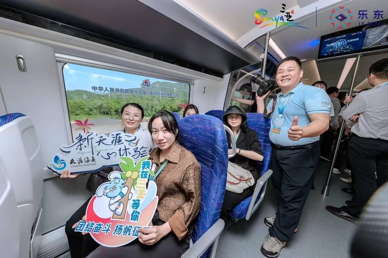 “天涯海角”列車,外觀設計融入“天涯海角”等三亞代表性景觀元素,融合海洋藍、晚霞紫、三角梅紅等色彩,生動再現三亞旖旎的濱海風光。客室座椅主色調為海藍色,並用天涯石、海角石、南天一柱、海浪波紋等元素點綴,獨具三亞風情。