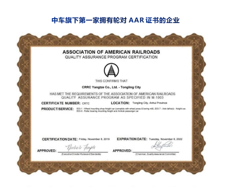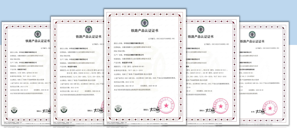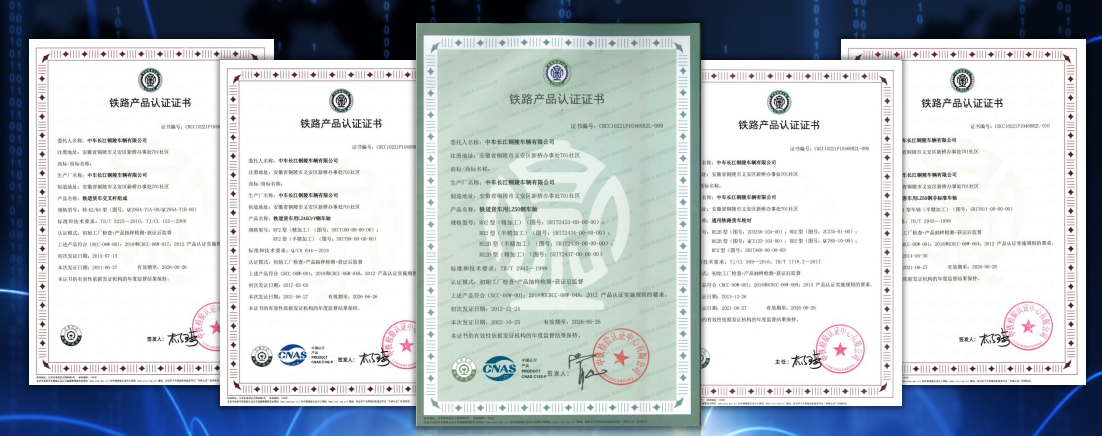 公司先後通過了ISO9001、ISO14000、GB/T28001—2001、AAR、ISO/TS 22163管理體係認證,國家測量管理體係AAA級認證,法國貝爾認證公司的IRIS體係認證。公司車軸產品先後通過了美國鐵路協會AAR M-101產品質量認證和AAR M-1003質量保證體係認證。多年來,公司連續十屆獲得安徽省文明單位稱號,先後獲得過“全國模範勞動關係和諧企業”、全國“重合同守信用”企業、“安徽省質量管理獎”、安徽省名牌產品生產企業、戰略性新興企業、高新技術企業、銅陵市市長質量獎、等上百項榮譽稱號,公司還獲批成為省級企業技術中心、省級博士後科研工作站設立單位,RE2B車軸獲評安徽省“工業精品”。
