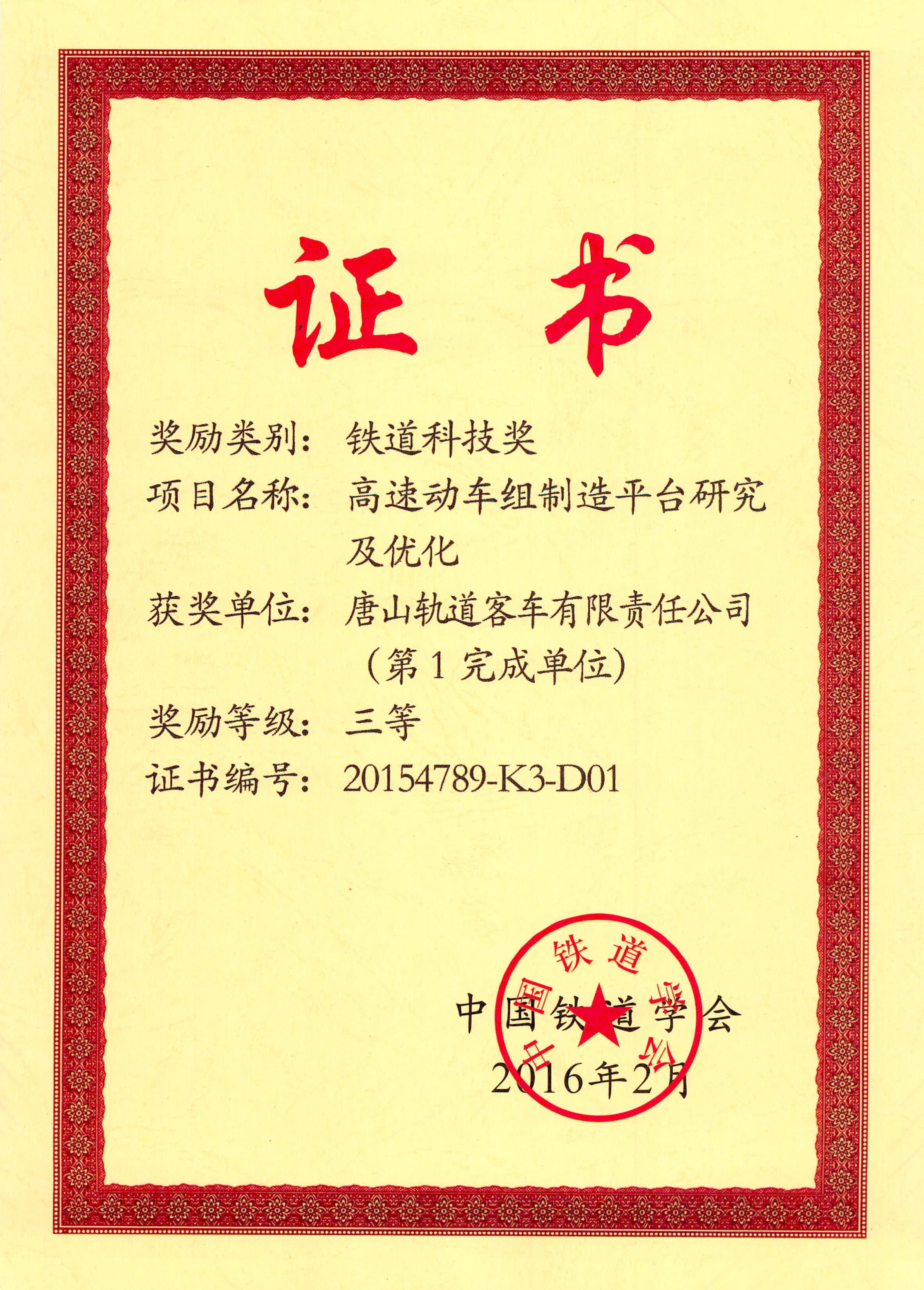 高速動車組製造平台研究及優化 鐵道科技獎 三等