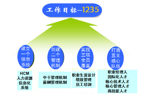 “十三五”期間,實現“建立一個信息係統,創建二個管理機製,實現三項全員覆蓋,打造五支核心隊伍”的“1235”人力資源管理工作目標。即,全麵建立公司HCM人力資源信息化管理係統;創建係統全麵的公司中層管理人員管理機製和薪酬管理機製;實現員工職業生涯全員覆蓋、績效管理全員覆蓋、員工培訓全員覆蓋;打造職業經理人、核心技術人才、核心管理人才、高技能人才和國際化人才共五支核心人才隊伍,力爭培養職業經理200名、核心技術人員200名、核心管理人才100名,國際化人才100名,技能人才中高技能人才占比達到65%以上。