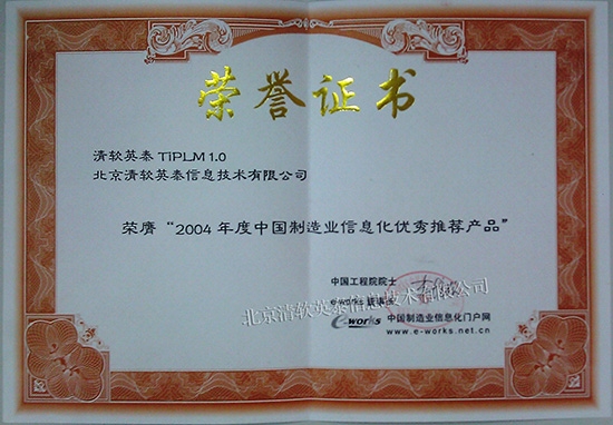 2004年度中國製造業信息化優秀推薦產品(TiPLM)