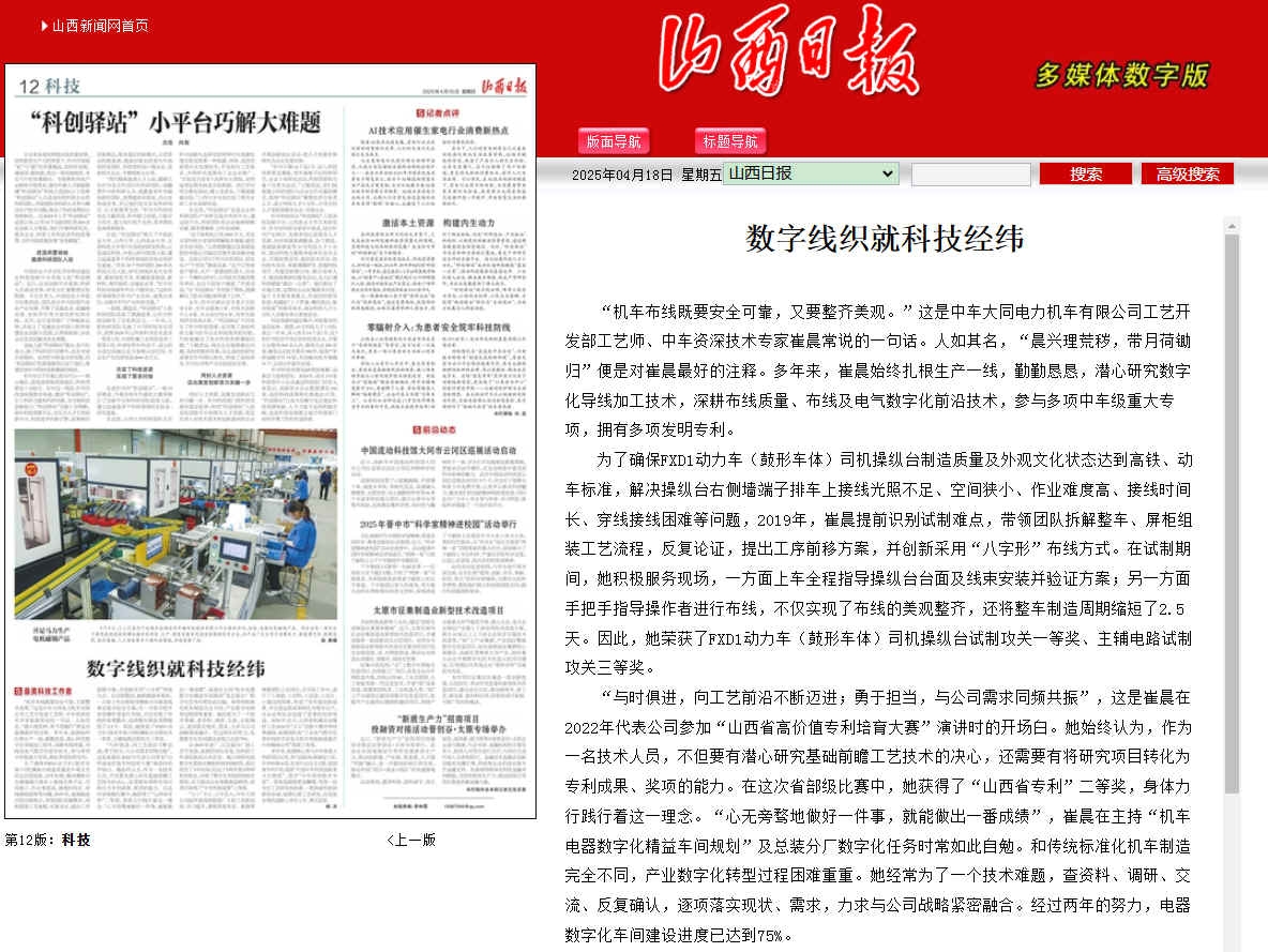 “五小”不小、小中見大,中車大同公司始終重視和鼓勵廣大職工創新創效、學習提升,展現青春風采。崔晨帶領著團隊立足崗位,在實際工作中,進行了小革新、小發明、小改造、小設計、小建議的探索,形成了有價值創新成果,並且把這些成果轉化為現實生產,為企業和社會創造了顯著的經濟效益。2024年12月,山西省機械冶金建材工會2024年“五小”創新大賽評審結果揭曉,崔晨團隊的“工業電氣數字化預布線技術在電力機車智能製造提升中的精準應用”榮獲三等獎。