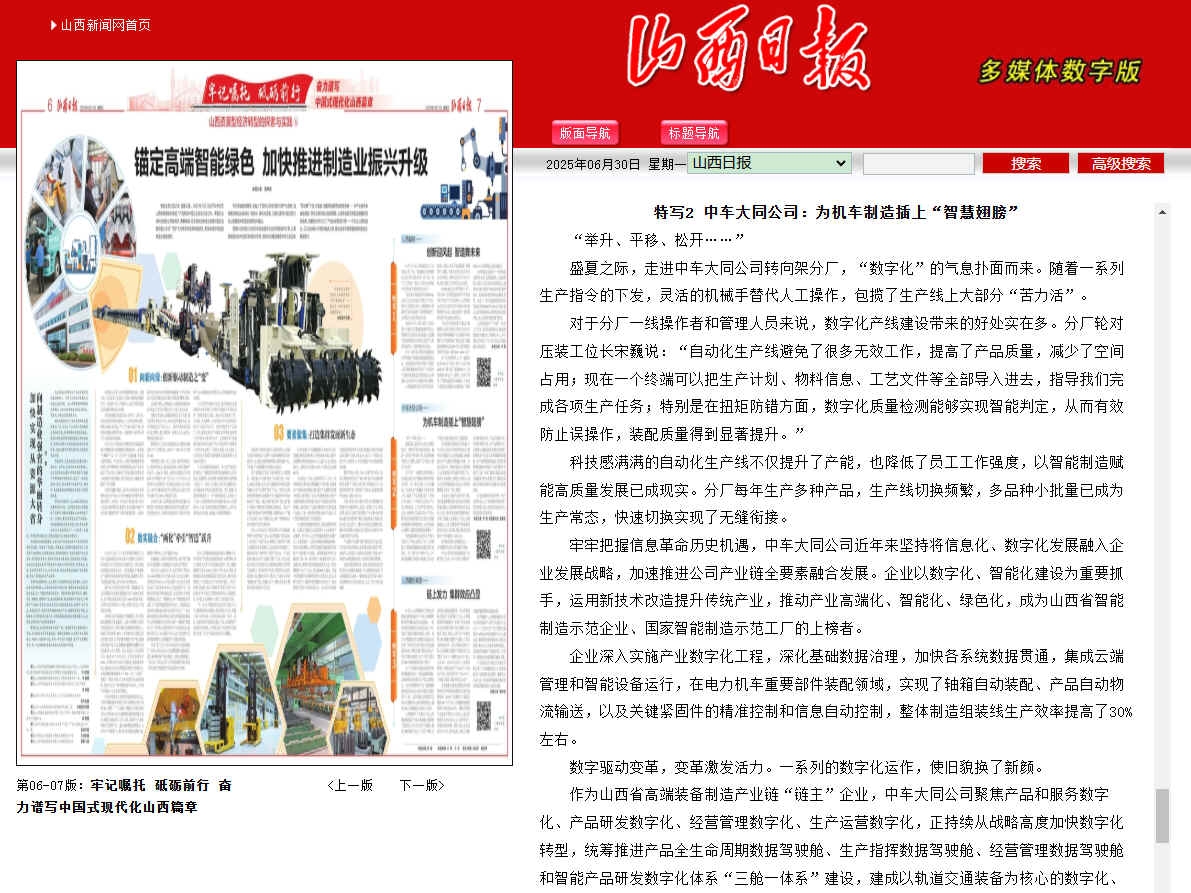 作為山西省高端裝備製造產業鏈“鏈主”企業,中車大同公司聚焦產品和服務數字化、產品研發數字化、經營管理數字化、生產運營數字化,正持續從戰略高度加快數字化轉型,統籌推進產品全生命周期數據駕駛艙、生產指揮數據駕駛艙、經營管理數據駕駛艙和智能產品研發數字化體係“三艙一體係”建設,建成以軌道交通裝備為核心的數字化、精益化高端裝備製造商和係統解決方案提供商。