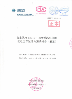 CWT type wind turbines manufactured by CNR have obtained the China Electric Power Research Institute certification, including low voltage ride through capability, power quality, power conditioning, power grids and other functional suitability certification testing, and obtained qualification certificates, met requirements of the grid condition fully.