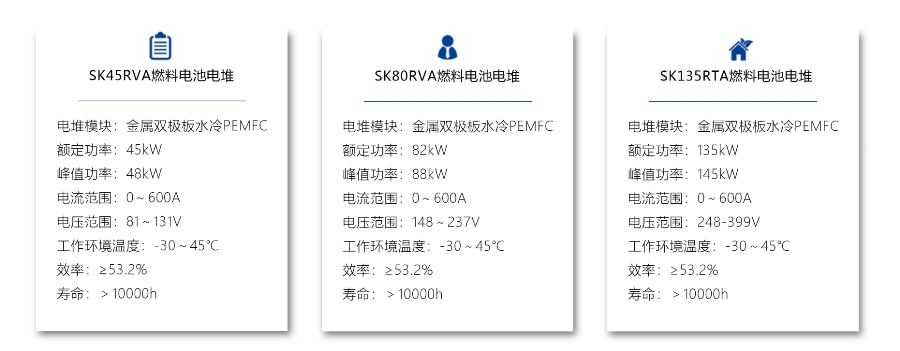 公司堅持“以氫能動力係統為核心的同軸多元化發展“的業務定位,沿著係統上下遊延伸產業鏈,陸續開發出多款燃料電池電堆,電堆額定功率覆蓋45kW~135kW,目前已具備量產能力。