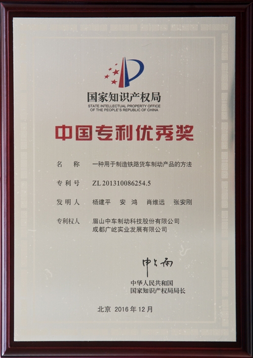 近期,四川省知識產權局在成都翔宇賓館召開2017年四川省專利獎及十八屆中國專利獎(四川省獲獎單位)的表彰大會。我公司專利“一種用於製造鐵路貨車製動產品的方法”專利號“ZL201310086254.5”榮獲第十八屆中國專利優秀獎,並現場領取了獲獎證書。