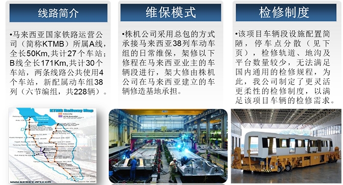 2011年,株機公司獲得了馬來西亞吉隆坡38列城際動車組為期兩年的動車組日常維護保養合同以及5年維保協議。2011年8月(yue),株(zhu)機(ji)公(gong)司(si)迅(xun)速(su)在(zai)馬(ma)來(lai)西(xi)亞(ya)吉(ji)隆(long)坡(po)成(cheng)立(li)了(le)南(nan)車(che)吉(ji)隆(long)坡(po)維(wei)保(bao)公(gong)司(si),通(tong)過(guo)從(cong)株(zhu)機(ji)公(gong)司(si)派(pai)遣(qian)一(yi)支(zhi)專(zhuan)業(ye)的(de)維(wei)保(bao)團(tuan)隊(dui),並(bing)在(zai)馬(ma)來(lai)西(xi)亞(ya)招(zhao)聘(pin)一(yi)定(ding)比(bi)例(li)的(de)本(ben)地(di)員(yuan)工(gong),經(jing)過(guo)現(xian)場(chang)和(he)理(li)論(lun)培(pei)訓(xun)後(hou)上(shang)崗(gang)開(kai)展(zhan)維(wei)保(bao)工(gong)作(zuo)。