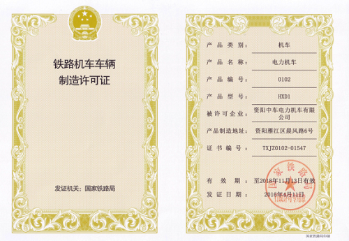 2013年11月 公司獲得HXD1型機車《鐵路機車車輛製造許可證》
