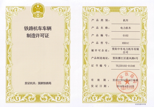 2012年9月 獲得HXD1C型機車《鐵路機車車輛製造許可證》